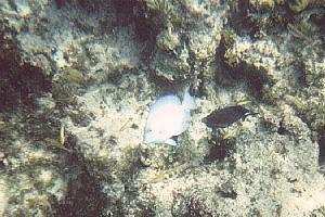 The weather changed constantly, we had sun and rain. When I went snorkeling, it started to rain, but I went anyway. Snorkeling was so so: the biggest fishes were near the area where the waves crashed on the corals and I was afraid to approach too close to the corals. Elsewhere visibility was better, specially when the sun came out. Same kind of fishes as the day before, like the bluehead wrasses below, but it's always fun to observe them. No barracuda though.