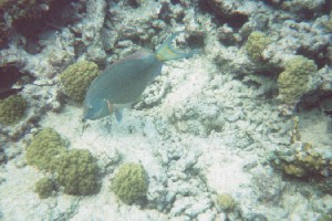 (Sparisoma viride)One of the most beautiful fishes I saw there, with bright colors, and it was commonly found. This is the male, which measure about 1 to 1 1/2 ft long. The female is smaller, brownish with white scales. The yellow areas on its tail are the most noticeable difference between the spotlight and and its relative redband parrotfish.