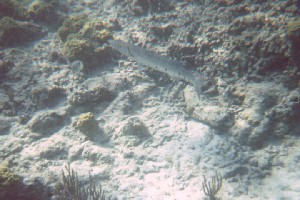(Sphyraena barracuda)It was very exciting to see this one so close to the beach. I had seen one in a dive before. This one was probably not more than 2 ft long, though they can reach 6 ft. They have a silver body with some black spots and pointed teeth and are often swimming alone.