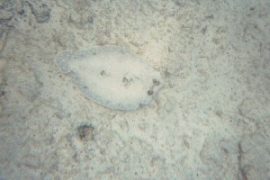 (Bothus ocellatus)Flounders are amazing! They are very flat and most of the time lie on the bottom, blending with the background. In another occasion I saw a darker flounder, brownish. They are around 5 in long. I was told they are born with one eye on each side, then one of the eyes migrate to the top of the fish.