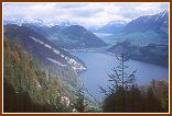 A popular tour is the world's steepest cog railway to Mt. Pilatus, with a 48% inclination. It is located at Alpnachstad, 20 minutes away from Luzern's train station (or 1 1/2h by boat, which was free for Eurailpass holders). It was sunny down hill when I caught the train, allowing a nice view of the lake, the city and the nearby valleys. |